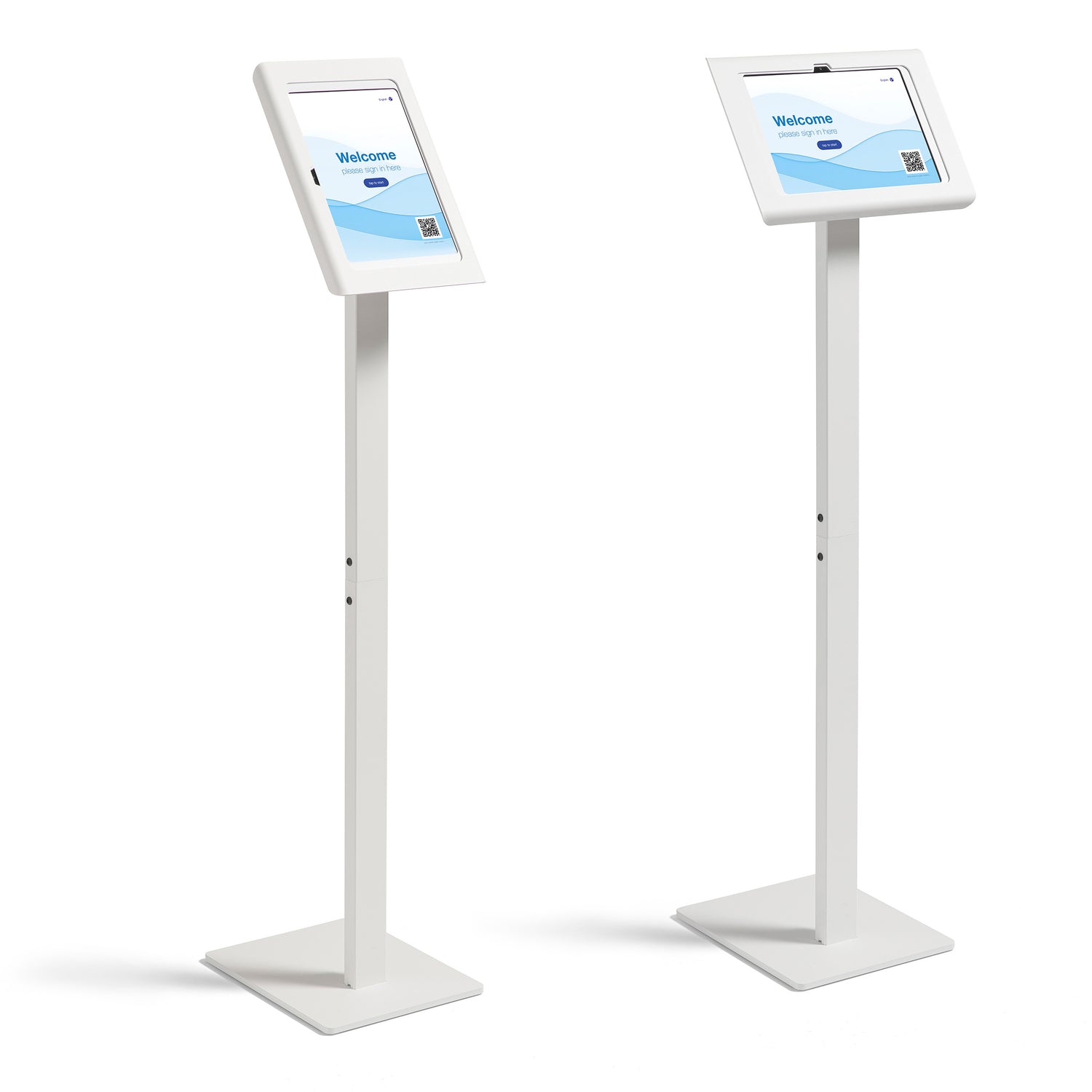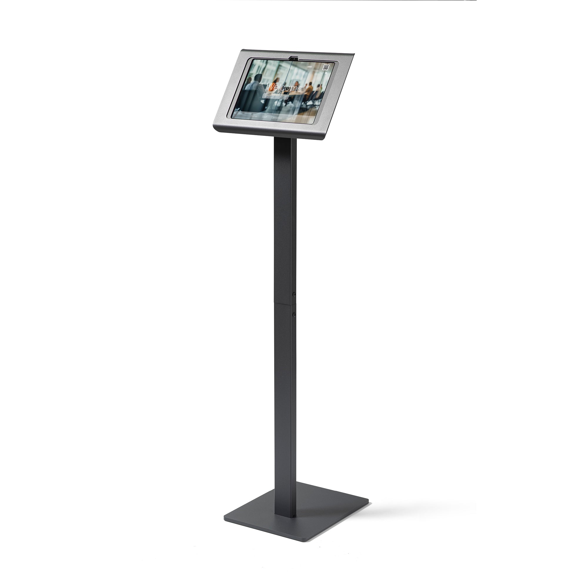 Ideal for displaying digital content at trade shows, retail stores, hospitals, offices, or showrooms, it offers a clean and professional way to engage visitors or share information. With its refined appearance and robust construction, the Tabdoq iPad Floor Stand combines style, reliability, and functionality for any semi-public setting.